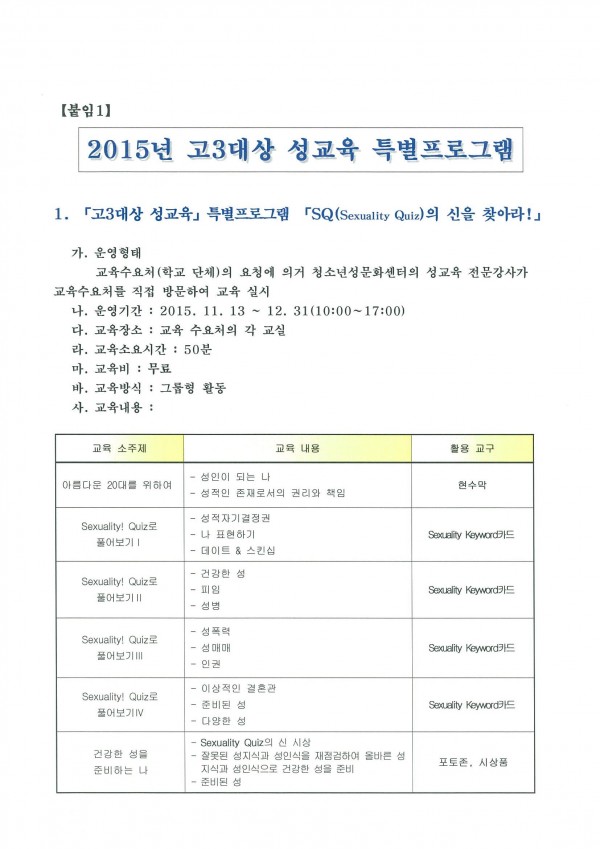 2015년 고3대상 성교육 특별프로그램 운영 협조 요청
