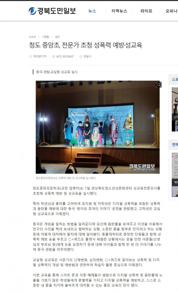 2022.06.07 청도 중앙초, 전문가 초청 성폭력 예방·성교육-경북도민일보