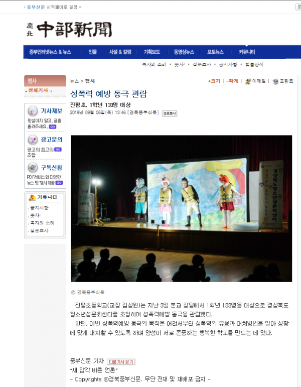 9.6 성폭력 예방동극 관람-진평초- 중부신문 작성자:관리자 등록일:20-02-04 14:23 댓글:0건 조회수:10,826회 본문 .@CboundaryN@h*@CboundaryN@ 목록 이전글 9.8 후포초등학교, 아동극으로 성교육예방해요- 대경일보 20.02.04 다음글 9. 3 진평초, 성폭력예방 동극 - 구미뉴스 20.02.04 댓글목록 댓글목록 등록된 댓글이 없습니다.