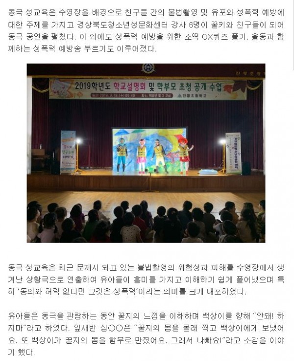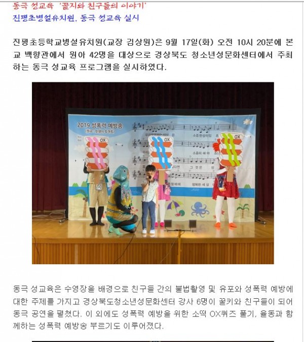 9.17 동극성교육\"꿀지와 친구들의 이야기\"-진평초, 병설유치원 -구미뉴스 작성자:관리자 등록일:20-02-04 14:25 댓글:0건 조회수:10,960회 본문 .@CboundaryN@h*@CboundaryN@ 목록 이전글 9.22 찾아가는 성폭력예방교육실시-환경일보 20.02.04 다음글 9.8 후포초등학교, 아동극으로 성교육예방해요- 대경일보 20.02.04 댓글목록 댓글목록 등록된 댓글이 없습니다.