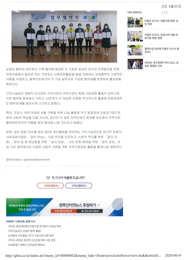 - 이전글 20.6.3 구미시설공단 등 10개 기관, 지역사회공헌 협력네트워크 구축 업무협약-경북일보 20.08.10