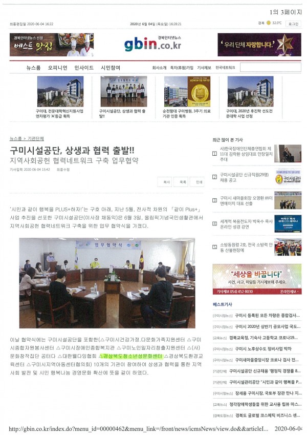 20.6.3 구미시설공단, 상새과 협력 출발 -지역사회공헌 협력네트워크 구축 업무협약-경북인터넷뉴스