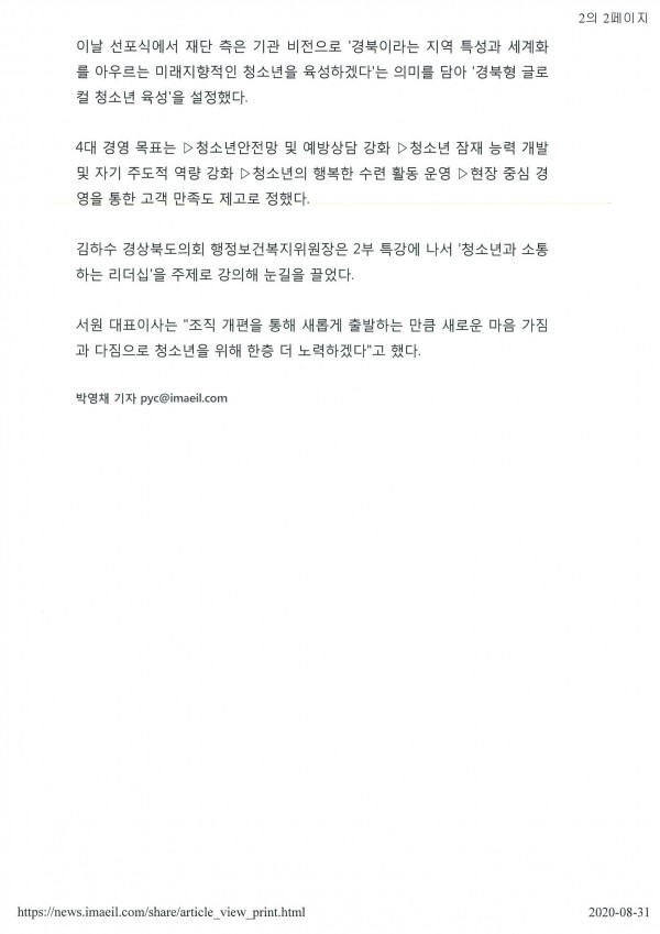 - 이전글 20.08.20. 경상북도청소년육성재단 기관비전 및 경영목표 선포식 -매트로신문사 20.08.31
