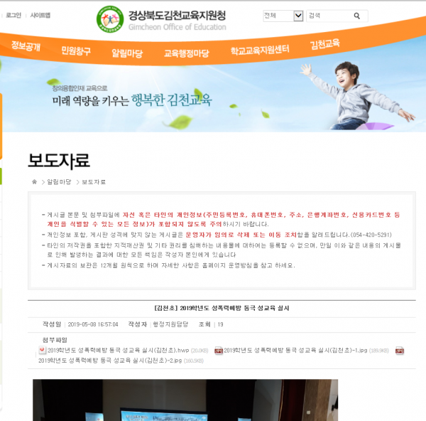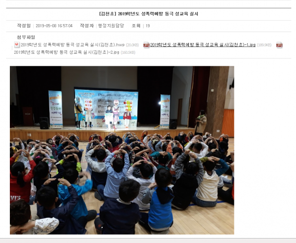 5.8 김천초등학교 2019년도 성폭력예방동극 성교육 실시-김천교육청홈페이지 홍보 작성자:관리자 등록일:20-02-04 13:59 댓글:0건 조회수:11,345회 본문 .@CboundaryN@h*@CboundaryN@ 목록 이전글 6.26 봉계초, 동극으로 배우는 성폭력예방교육 20.02.04 다음글 4.26오태초 성폭력예방 연극실시-경북타임즈 20.02.04 댓글목록 댓글목록 등록된 댓글이 없습니다.