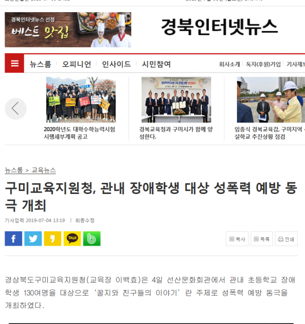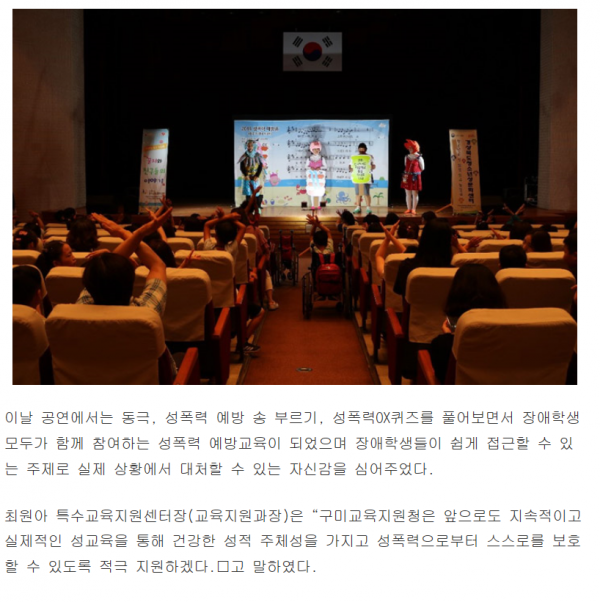 7.4 구미교육지원청 관내 장애학생 대상 성폭력예방동극개최-경북인터넷뉴스 작성자:관리자 등록일:20-02-04 14:02 댓글:0건 조회수:11,002회 본문 .@CboundaryN@h*@CboundaryN@ 목록 이전글 7.4 구미교육지원청 관내 장애학생 대상 성폭력예방동극개최-경북IT뉴스 20.02.04 다음글 6.26 봉계초, 동극으로 배우는 성폭력예방교육 20.02.04 댓글목록 댓글목록 등록된 댓글이 없습니다.