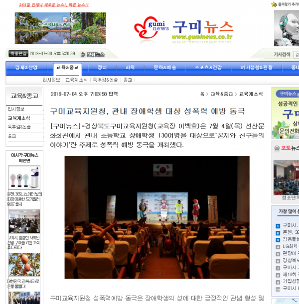 - 다음글 7.4 구미교육지원청 관내 장애학생 대상 성폭력 예방 동극 꿀지와 친구들의 이야기 개최-구미일보 20.02.04