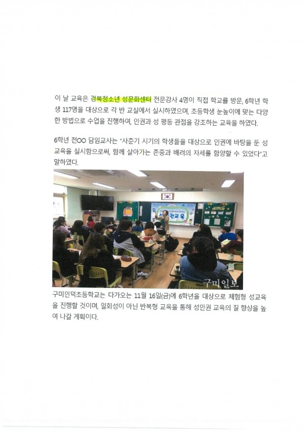 10.22. 구미인덕초등학교,경북청소년성문화센터 성인권교육실시-구미일보
