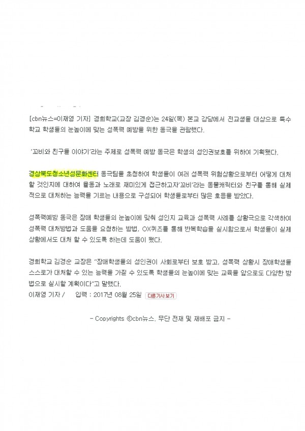 @CboundaryN@h*1911/59a7acdd370ac.jpg|354262|jpg|08.25. 경주경희학교, 성폭력예방동극 관람-cbn뉴스.jpg#@CboundaryN@- 이전글 08.28. 경주경희학교, 지역사회와 함께하는 학부모 성교육-cbn뉴스 17.08.31